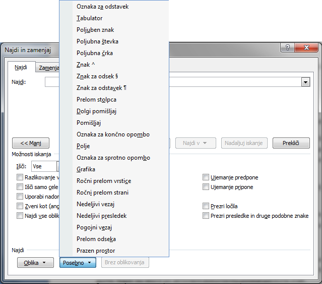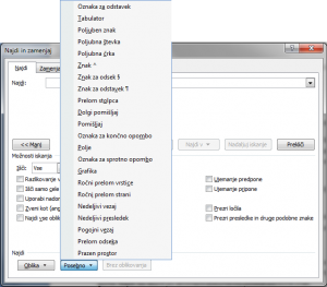 V oknu iskanja kliknite gumb ‘Več >>>’ in okno se razširi tako, da je spodaj viden gumb ‘Posebno’, ki odpre hitri meni s prikazom posebnih znakov. Iz menija izberite želeni znak in to je vse. Ob pritisku na gumb ‘Najdi’ bo Word po aktivnem dokumentu poiskal ustrezen znak.