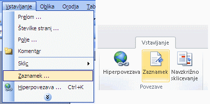Nato označeni tekst definirate kot zaznamek, kar v Wordu 2003 (in nazaj) storite tako, da izberete menu Vstavi / Zaznamek, v Wordu 2007 (in naprej) pa trak Vstavi / Zaznamek.
