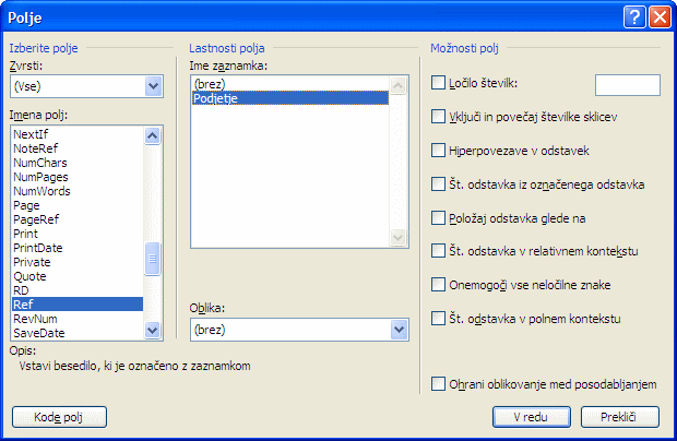 V vsakem primeru pa se vam odpre okno za vstavljanje polj, v katerem poiščete polje REF in ga vstavite v dokument.