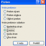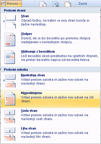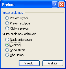 Postavite se na konec teksta in tja vrinite zvezni prelom stolpca. V Wordu 2003 to dosežete preko menija Vstavljanje /Prelom in odpre se novo okno. V Wordu 2007 /2010 pa opcijo najdete na zavihku Postavitev strani pod izbiro Prelomi.